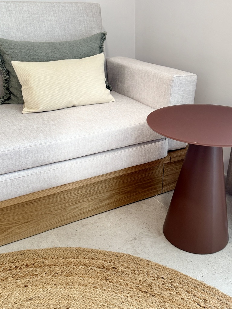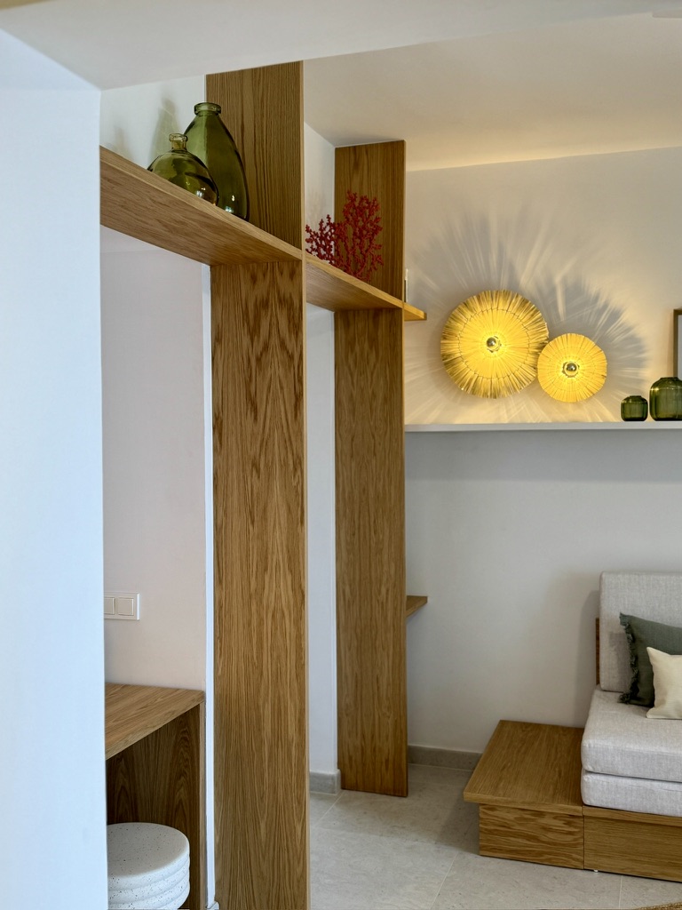 En la zona de estar, se integra un sofá a medida con base de madera, acompañado de una meseta lateral continua que funciona como apoyo decorativo y superficie útil. Además, se incorpora una balda superior lacada para exhibir piezas decorativas, iluminando visualmente el conjunto y aportando equilibrio.