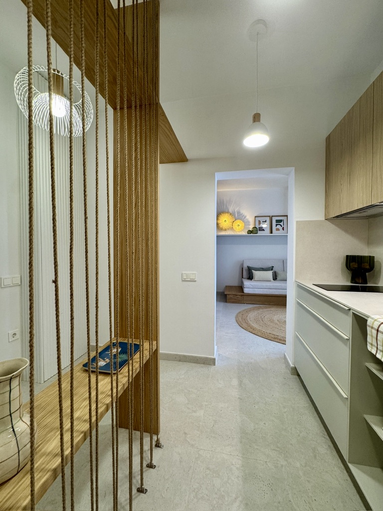 El diseño incluye un divisor ligero con cuerdas tensadas, acompañado de un módulo superior y una balda en madera, que permite separar ambientes sin perder amplitud ni luminosidad. La madera aporta textura y carácter, creando un elemento escultórico que embellece la zona de paso.
